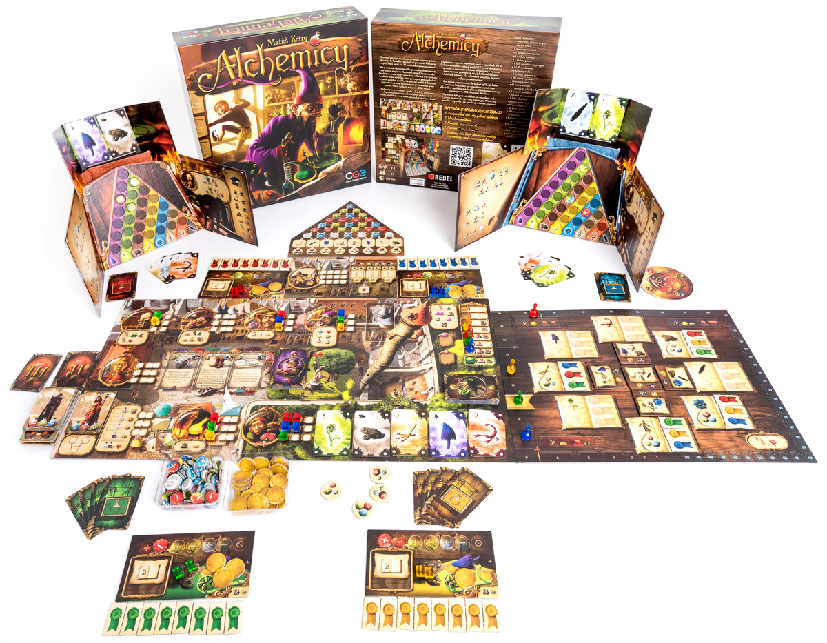 Uwaga: Do gry w Alchemików potrzebna będzie odpowiednia aplikacja na tablecie lub smartfonie. Aby ją zdobyć, należy zeskanować znajdujący się w insturkcji kod QR lub wejść tutaj: http://cge.as/ald. Aplikacja jest bezpłatna. Można też grać bez aplikacji, ale jeden z graczy wtedy nie bierze udziału w rozgrywce, przejmując zadanie mieszania eliksirów.