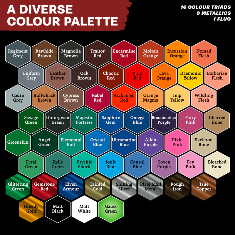 Wszystkie farby Warpaints Air są wstępnie zmieszane i gotowe do malowania aerografem. Gama Warpaints Air została opracowana w unikalnym i innowacyjnym systemie Triad - każdy pasujący kolor Warpaints Acrylics ma odpowiadający mu kolor Base i Highlight. Dzięki temu rozjaśnianie i cieniowanie to pestka, a malowanie armii jest jeszcze szybsze i bardziej spójne.