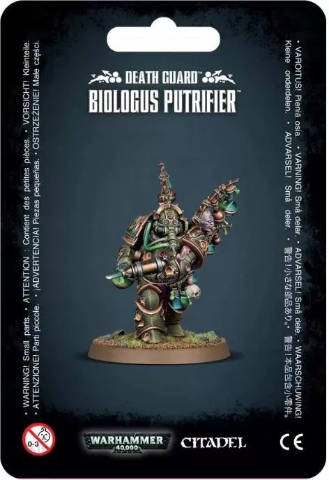 The great labour of the Death Guard is to spread Nurgle’s bounteous gift to every corner of realspace. The Biologus Putrifiers have a vital role to play in this process, for it is they who refine the batches of diseased slurry brewed by the Foul Blightspawn, and distil them to the utmost potency. From their backs dangle racks of blight grenades, churning with the latest strains of noxious plagues. With each volley of hurled ordnance, their epidemic spreads; injector pistols unleashing concentrated doses of foulness into their targets.