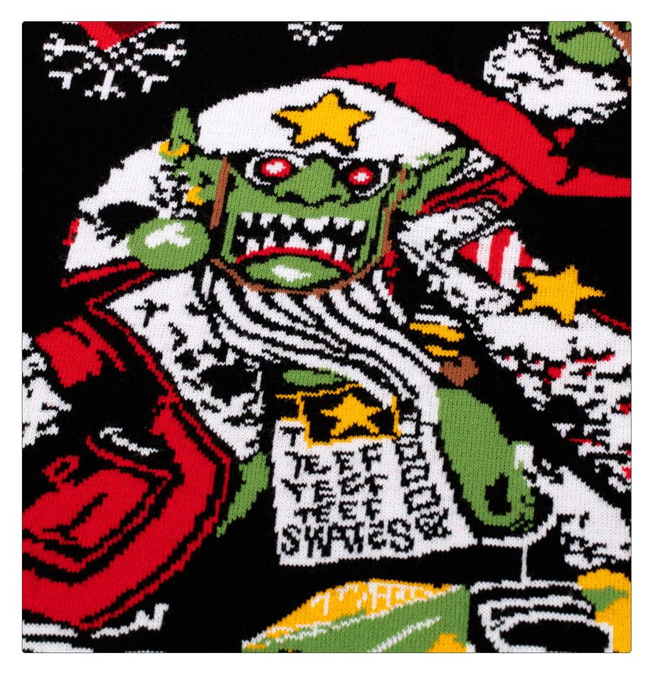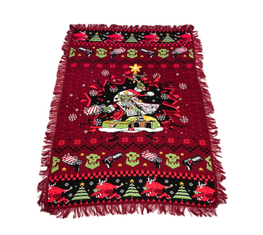 This wonderfully warm, red knitted blanket features a fun and festive Red Gobbo design based on his original Christmas-themed miniature, along with borders combining typical grot favourites like shootas, squigs – Bounca, no less – and leering ork face icons, as well as holiday decor like Christmas trees and snowflakes. It measures 102 x 160 cm, plus some fun frills.