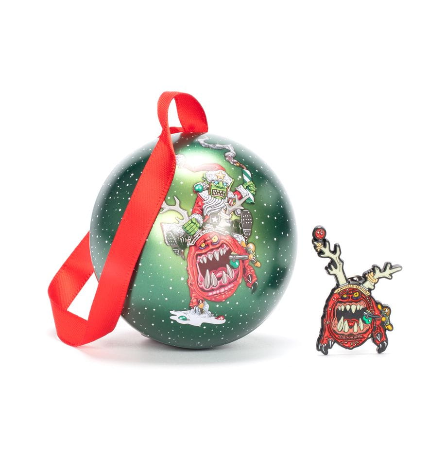 The portrait captures every detail of the grot hero and his noble steed, from his bauble earring to the festive candy-striped stick of dynamite, and Bounca sports his antlers and a string of lights. Open the bauble for a surprise – a full-colour pin badge of Bounca in all his manic glory.