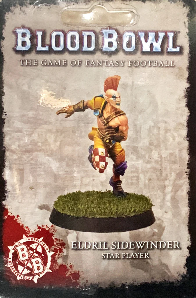 Should you be looking high and low for a Star Player for your Dark Elf, Wood Elf, High Elf or Elven Union Blood Bowl team – you can stop looking because here, in the lithe shape of Eldril Sidewinder, is one! Bemohawked and lightly armoured – clad in a leather harness and shoulder protector, gauntlets, pants and running shoes (with some pretty hefty studs in the soles, no doubt ready to splinter the shins of all who stand before him), Edril is a prime example of the sort of cheekbones and jawline you only get from Elves. His rules are available in Blood Bowl Death Zone Season One.