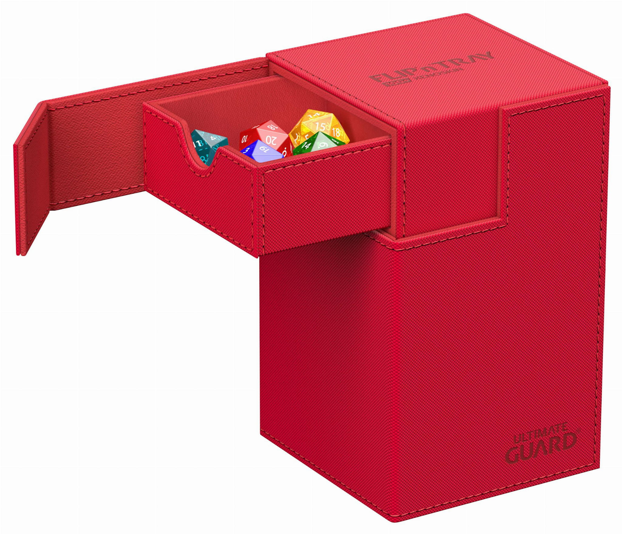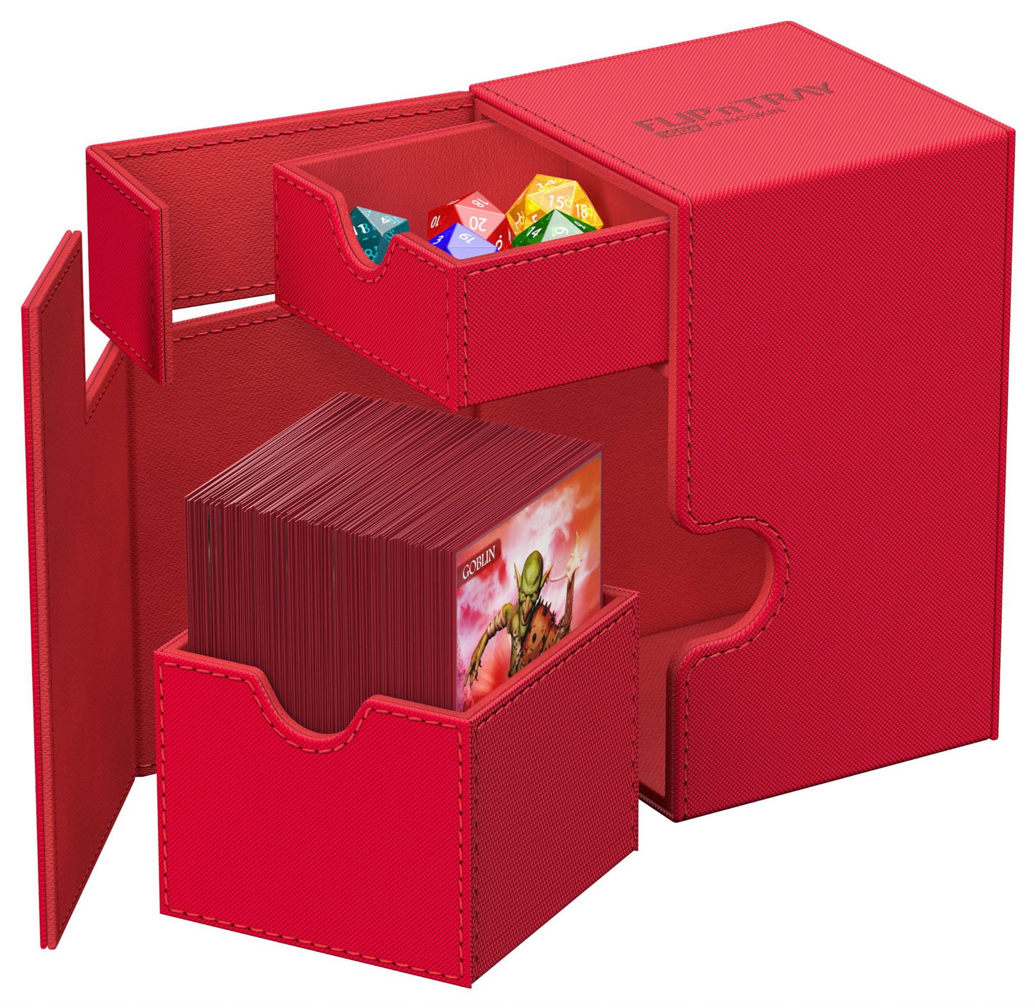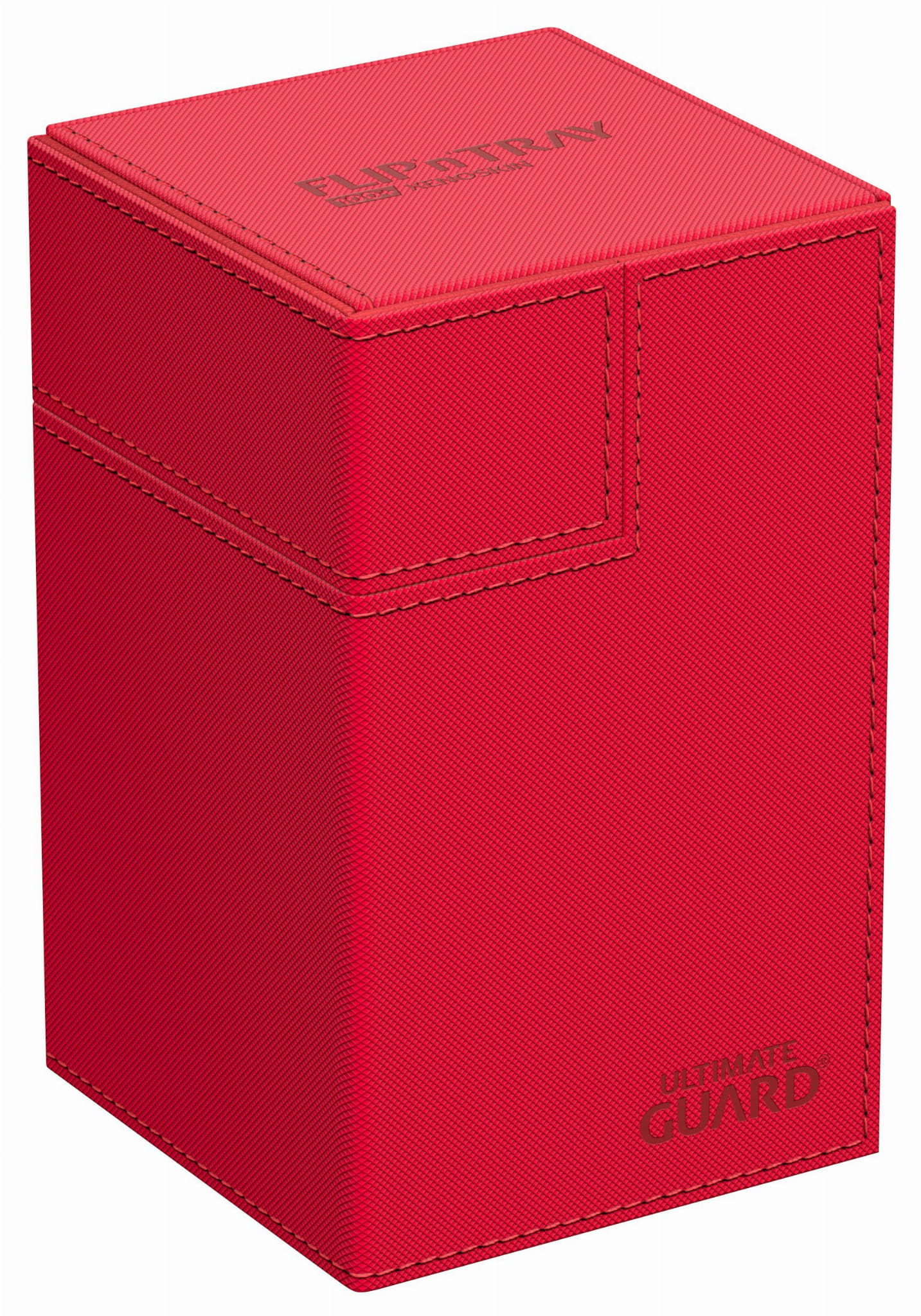 The quintessential Ultimate Guard deck box: a timeless monocolored design with strong magnetic closure, card and dice trays for safe storage of your deck, and a resistant but smooth Xenoskin surface. Looking for additional safety? With room for 100 double-sleeved or 120 single-sleeved cards in standard size, the Flip'n'Tray 100+ has it all.