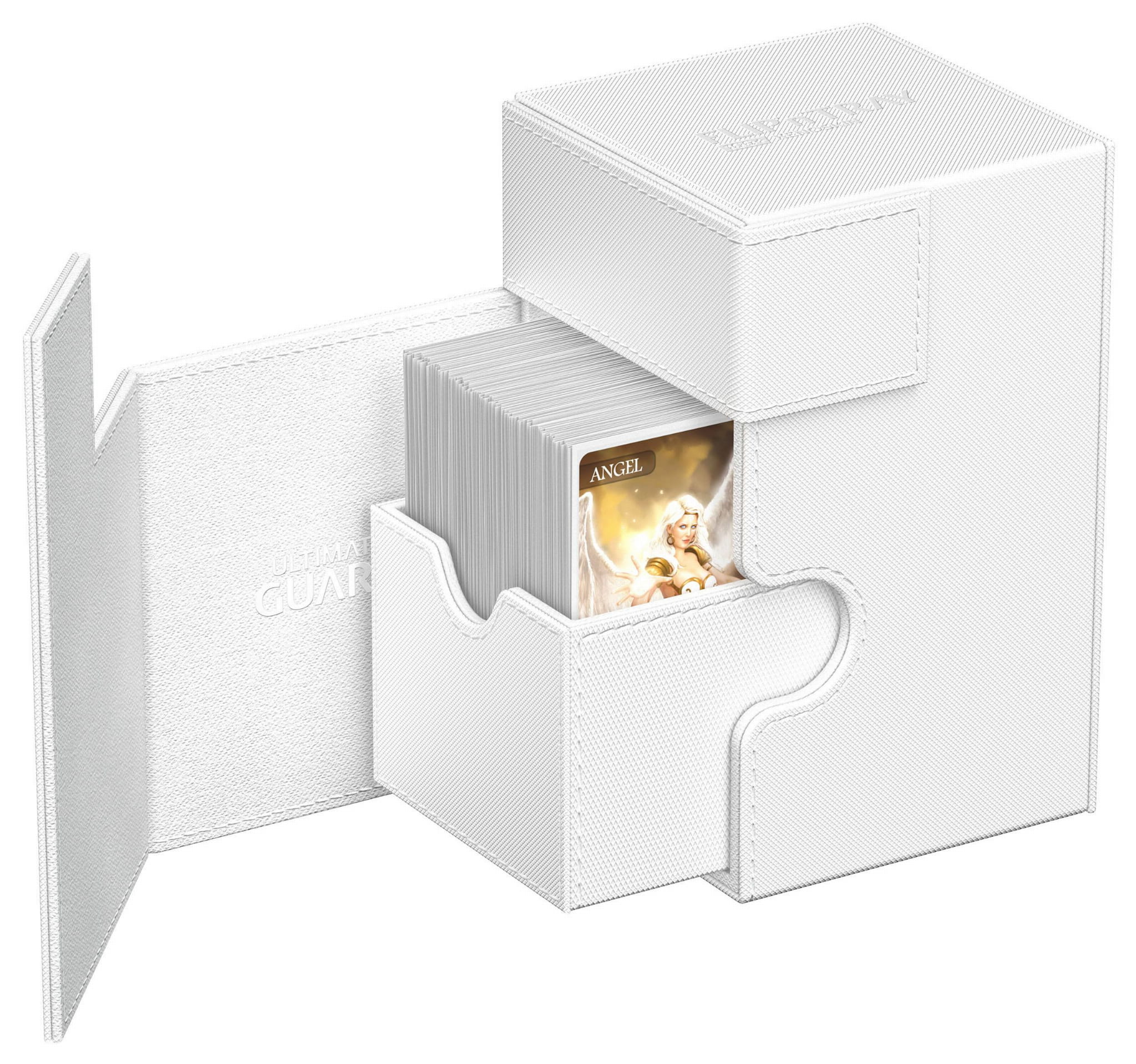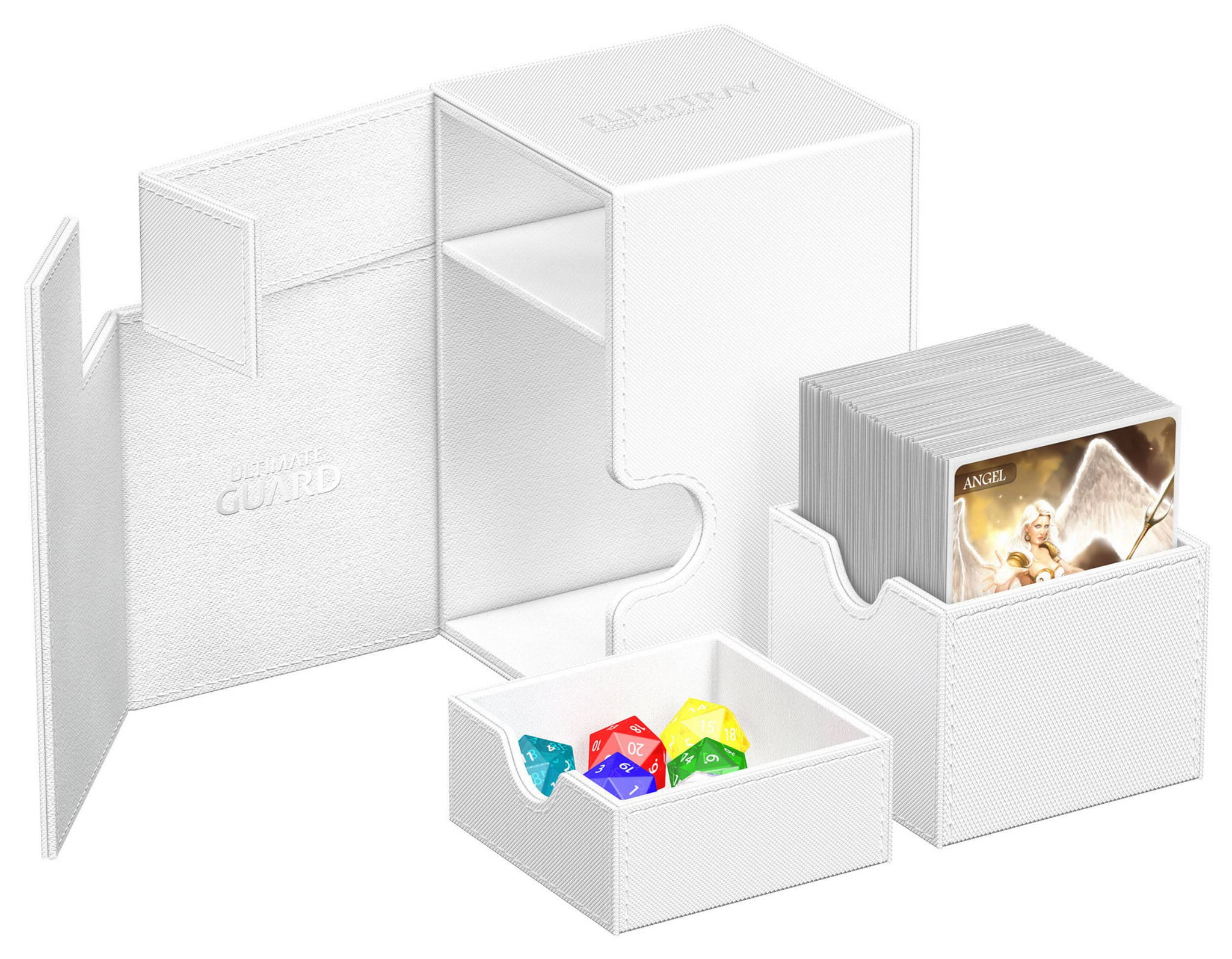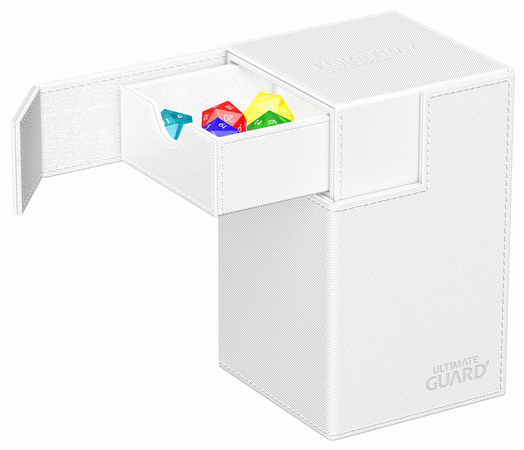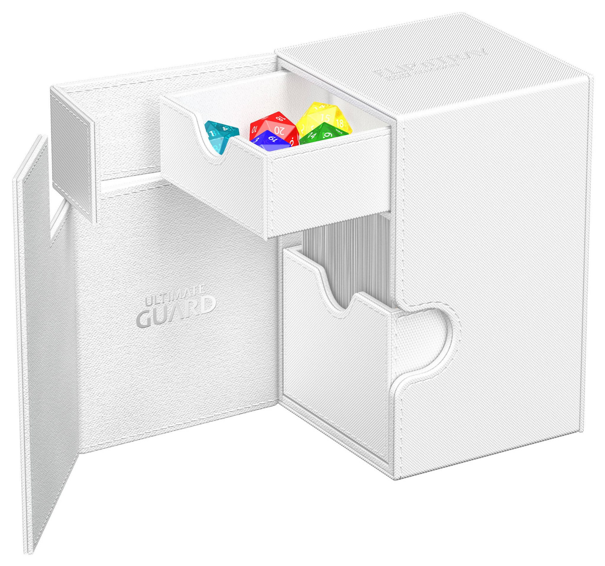 The quintessential Ultimate Guard deck box: a timeless monocolored design with strong magnetic closure, card and dice trays for safe storage of your deck, and a resistant but smooth Xenoskin surface. Looking for additional safety? With room for 100 double-sleeved or 120 single-sleeved cards in standard size, the Flip'n'Tray 100+ has it all.