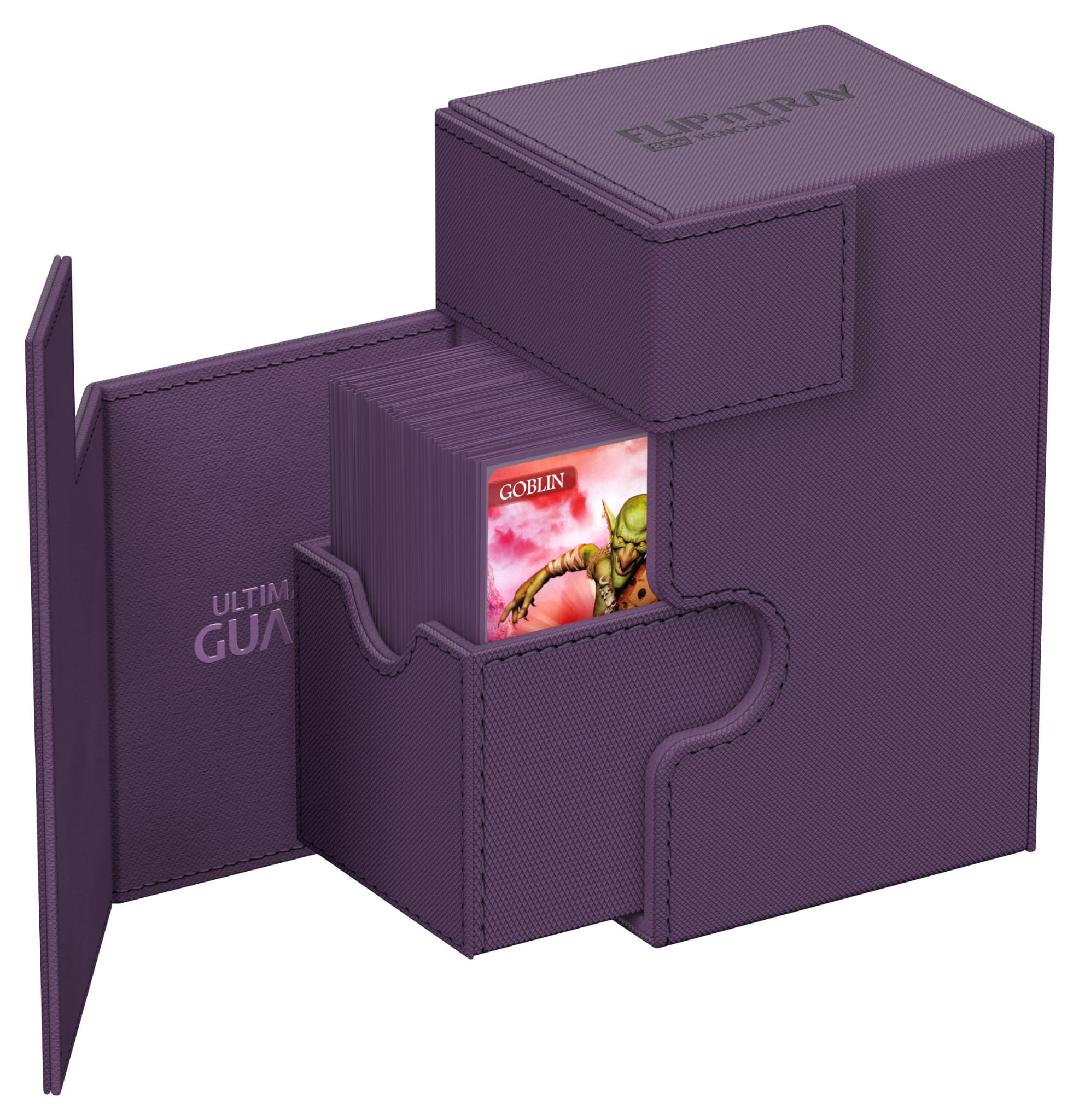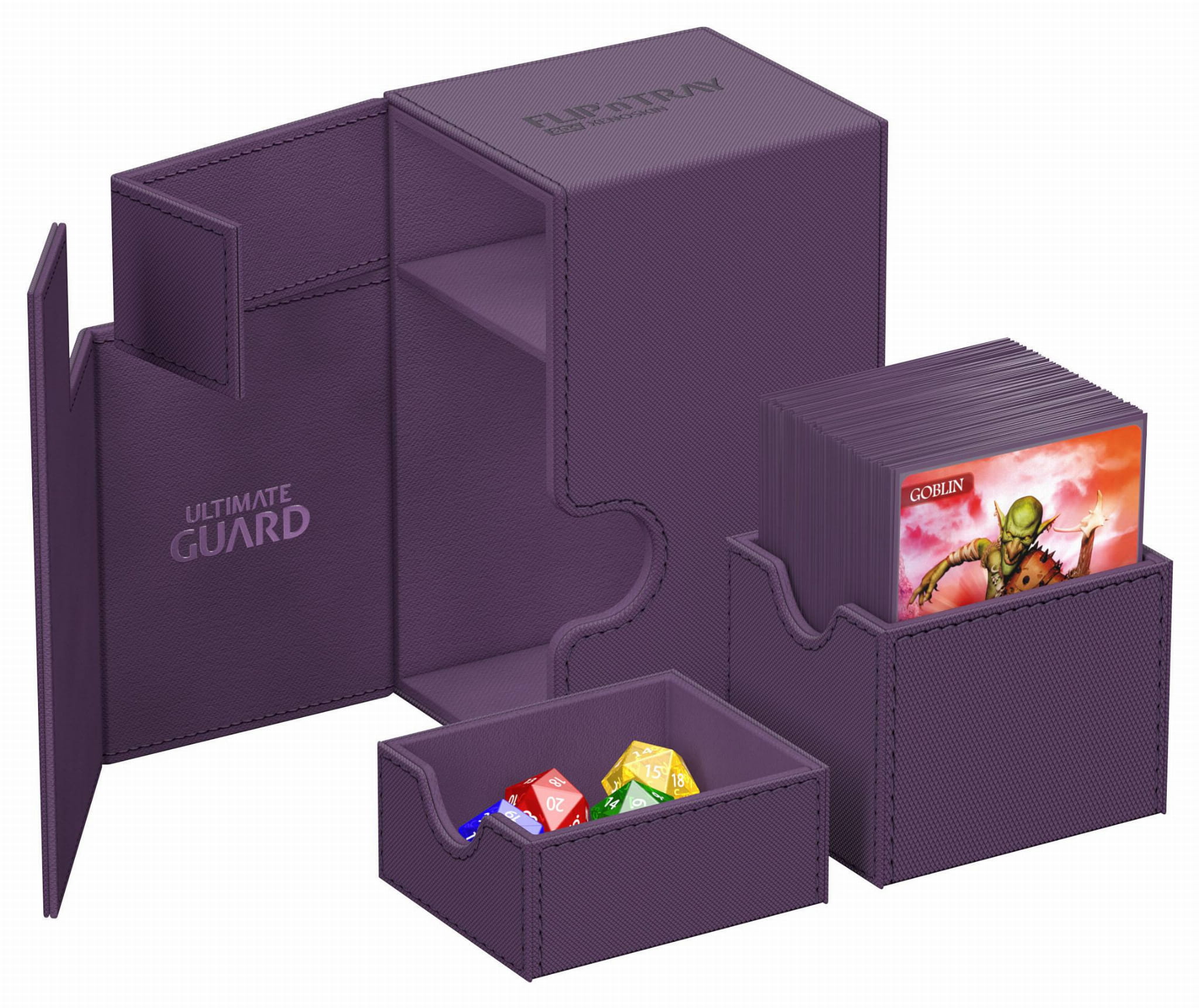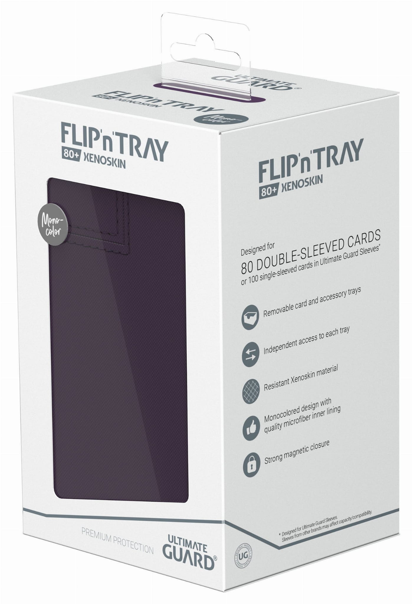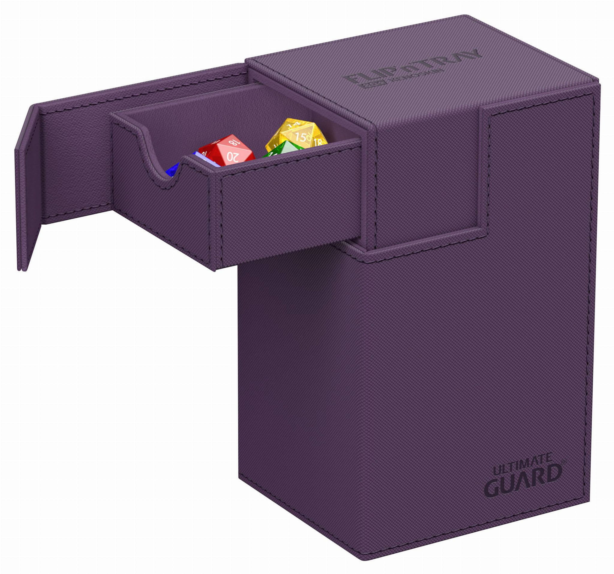 The quintessential Ultimate Guard deck box: a timeless monocolored design with strong magnetic closure, card and dice trays for safe storage of your deck, and a resistant but smooth Xenoskin surface. With room for 80 double-sleeved or 100 single-sleeved cards in standard size, the Flip'n'Tray 80+ has it all.