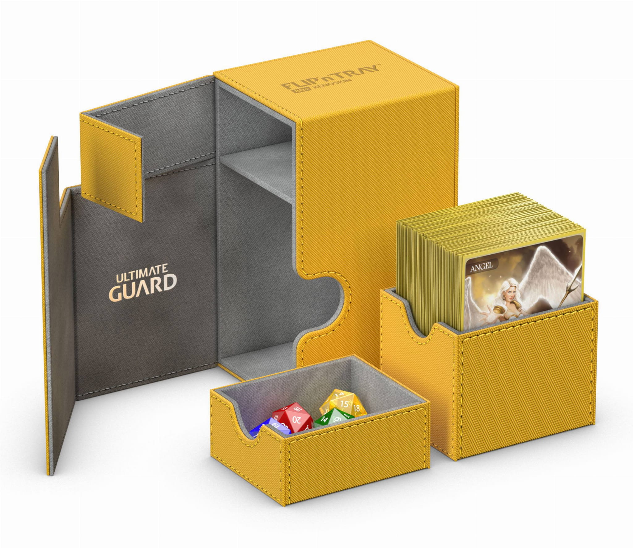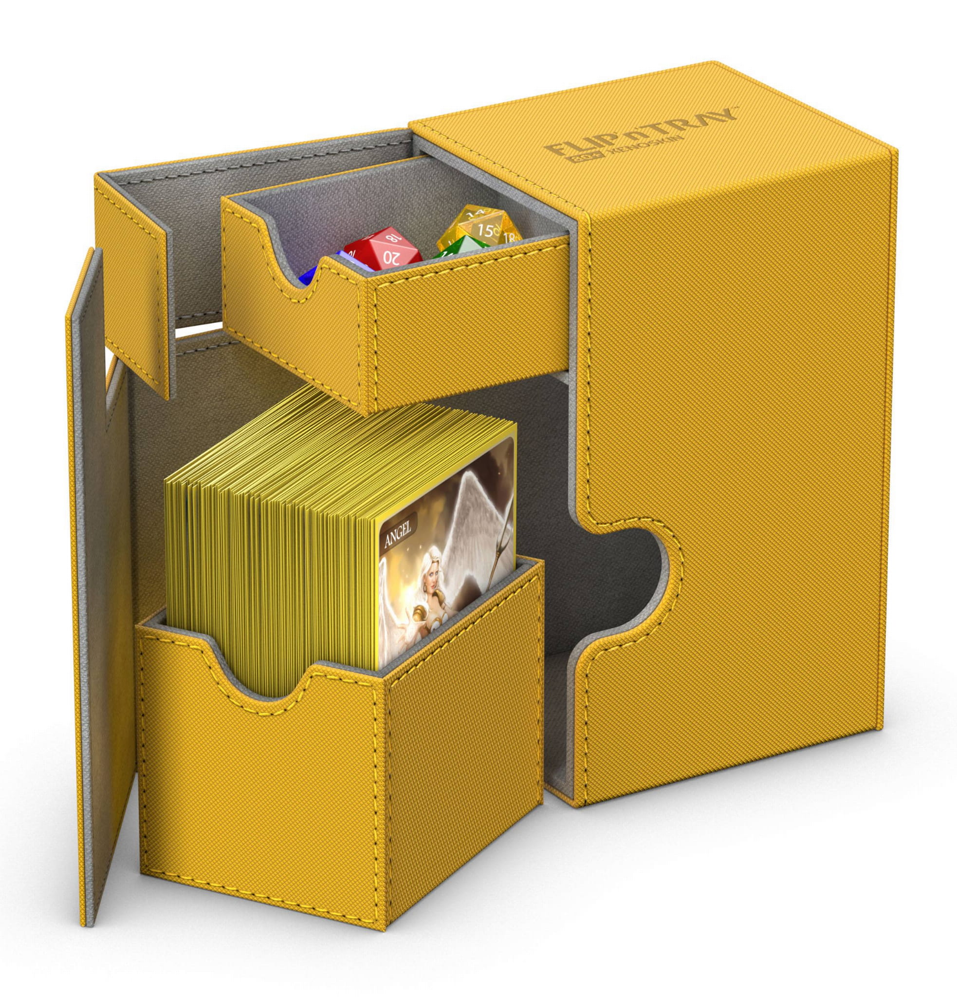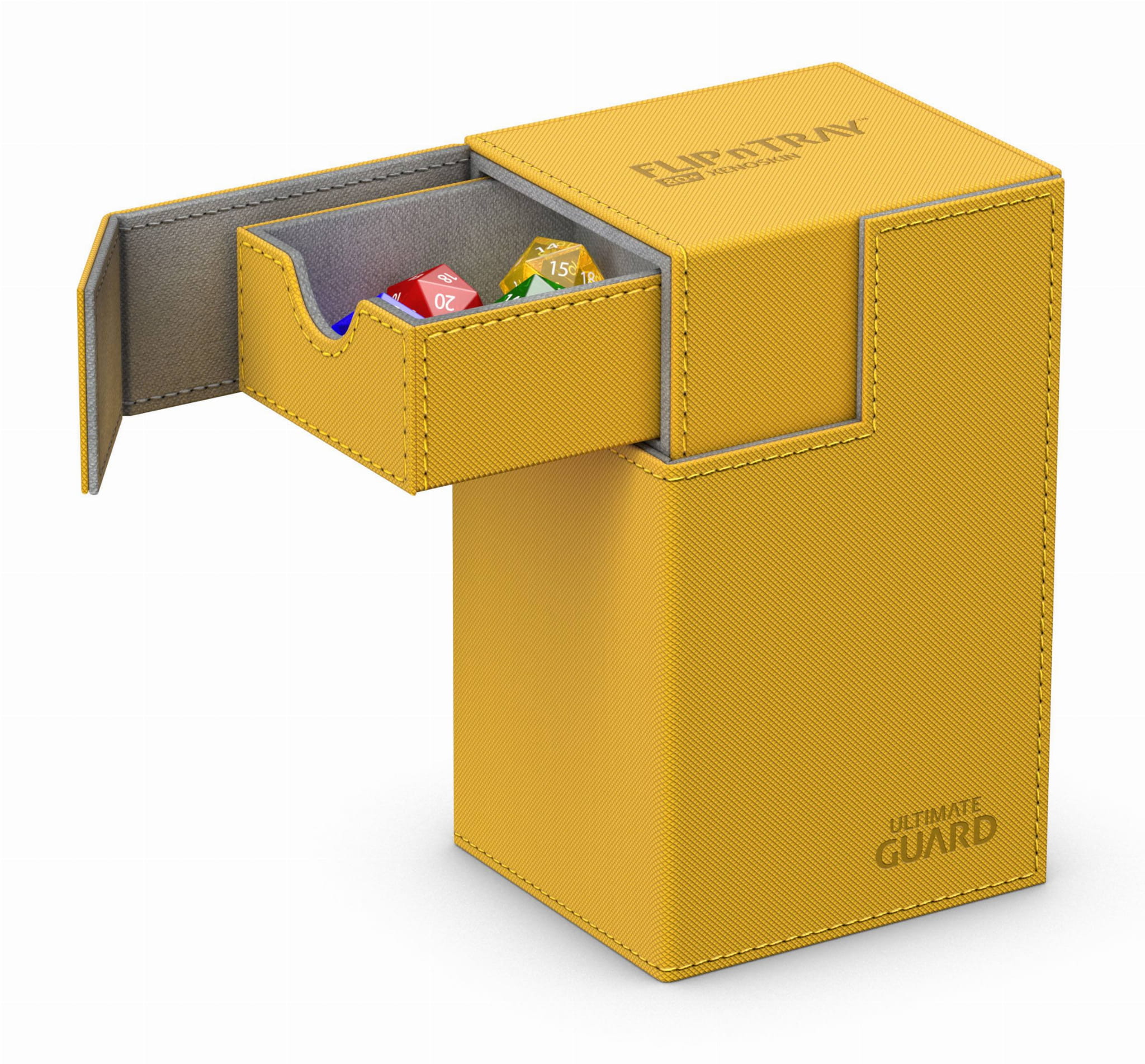 Premium XenoSkin card box with magnetic closure and card and dice trays for the protection and archival safe storage of double-sleeved cards in standard size.