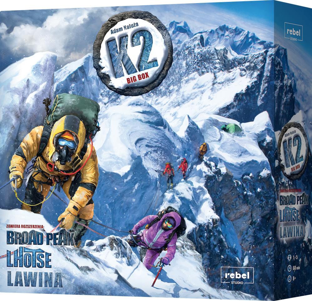 K2 to rodzinna gra planszowa, w której uczestnicy kierują dwuosobowymi zespołami himalaistów i próbują zdobyć tytułowy szczyt, a następnie bezpiecznie zejść na dół. W tym celu będziemy musieli wybrać odpowiednią drogę, zadbać o kondycję naszych wspinaczy oraz ich zaadaptowanie do zmiennych warunków pogodowych. W pudełku K2: Big Box oprócz gry podstawowej znajdziesz trzy ekscytujące rozszerzenia: Broad Peak, Lhotse (każde z nich zawiera dwie nowe trasy wspinaczki) oraz mini dodatek Lawina!