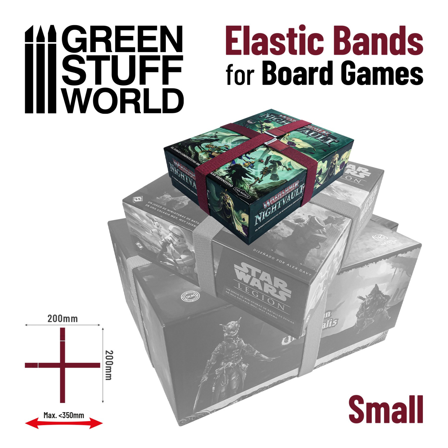 Zestaw 4 pasów na pudełka od gier planszowych lub bitewnych, które zapobiegają przypadkowemu otwarciu pudełka i wysypaniu zawartości podczas transportu.