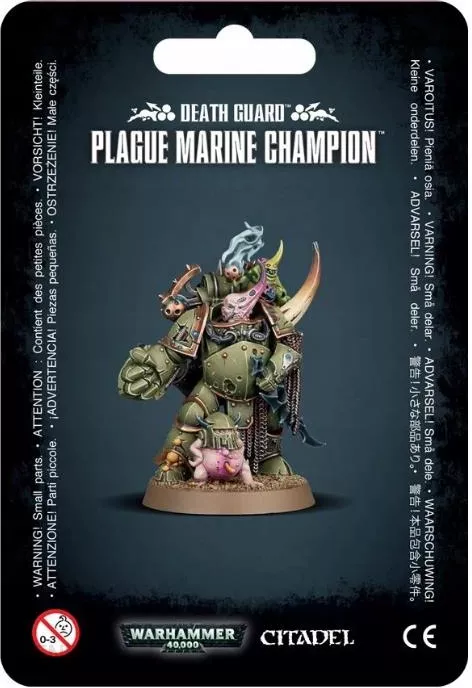 This multi-part plastic kit contains the components necessary to assemble a Plague Marine Champion, who can be added to a unit of Plague Marines. Clad in bulging, rusted power armour, he comes with a choice of two variant heads – one helmeted, and one bare (with an unsettlingly large horn growing out of his face…). Befitting his Champion status, he is decked out in chainmail, with a cloak prominently featuring the symbol of Nurgle. He is armed with a plaguesword and power fist, and includes a boltgun which hangs from his backpack. 2 Nurglings are included – one atop his shoulder, clutching a smoking censer, and one optional Nurgling for his base, comically clad in a Death Guard helmet.