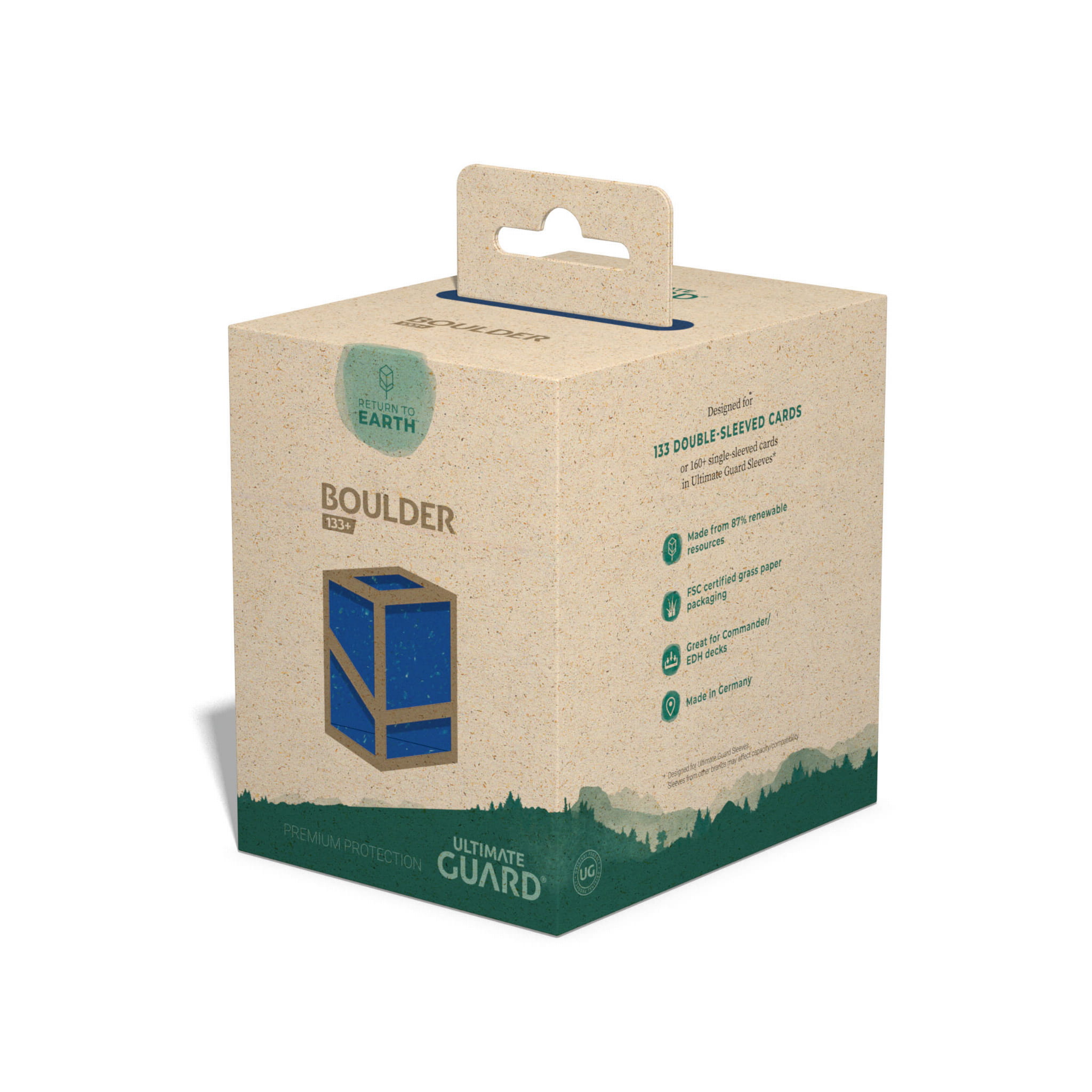 Ultimate Guard is very proud to present the bigger version of the world's first sustainable TCG deck box: the Ultimate Guard RTE Boulder 133+. With the Return to Earth line, you don't need to compromise between your hobby and your ambitions to make more sustainable choices. Now you can have it all - plus more space! Use this box to securely store double sleeved decks of up to 133 cards (optimized for Ultimate Guard sleeves). Go big or go home but be mindful of mother earth in the process.