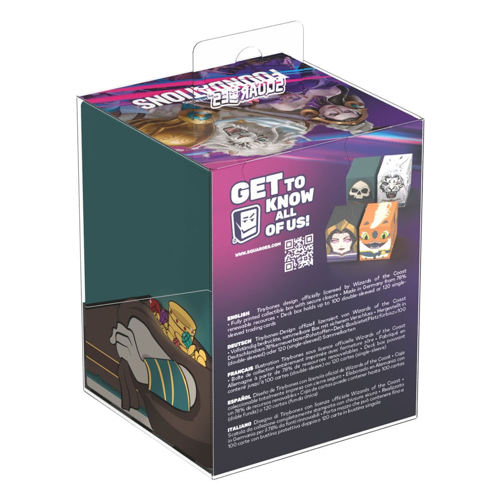 Collectible box for storing your deck, tabletop gaming accessories, and/or collectibles. Squaroe from the Magic: The Gathering edition holds up to 100 cards in double protective sleeves if used as a deck box. Squaroes are made from 78% renewable resources.