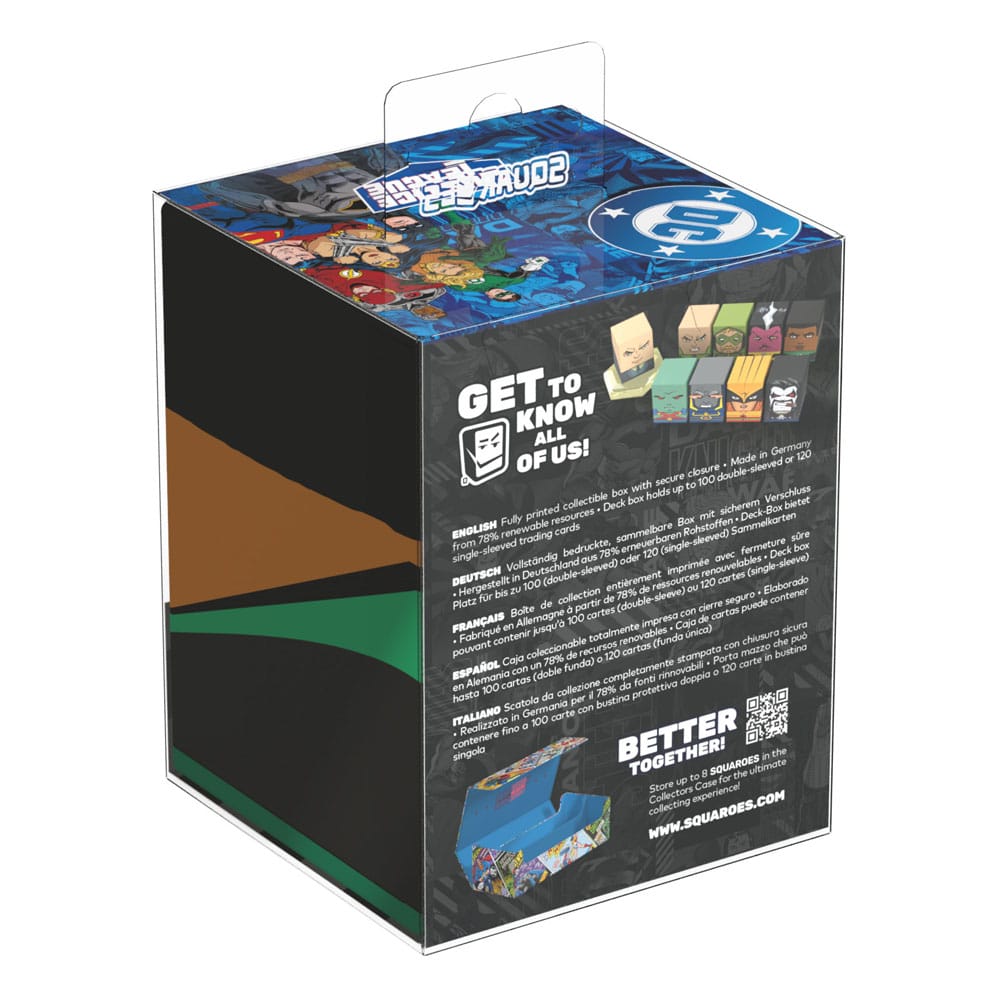 Collectible box for storing TCG decks, tabletop gaming accessories, and/or collectibles. The John Stewart™ Squaroe from the DC Justice League™ edition holds up to 100 cards in double protective sleeves if used as a deck box. Squaroes are made from 78% renewable recources.
