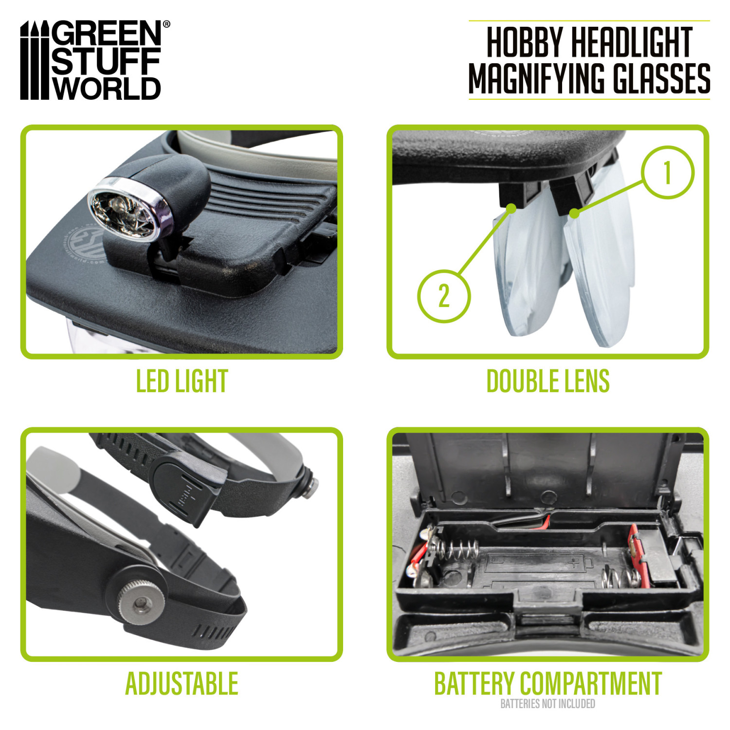 Magnifying glasses with light are also known as headband magnifiers or head-worn magnifiers. They consist of a headband that fits around the user's head, with a pair of lenses that can be adjusted for magnification. The lenses are interchangeable, allowing the user to switch between different magnification levels depending on the task at hand. It includes 4 different lens options as follows: 1.2x, 1.8x, 2.5x, and 3.5x