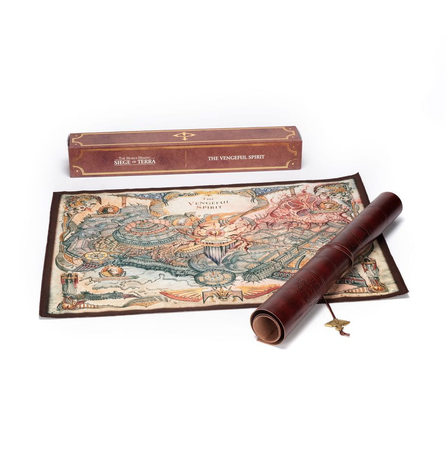This A2 (594mm by 420mm) sized map is a must-have for any fan of the Horus Heresy or Siege of Terra series of novels. It is printed on cotton, wrapped in a faux leather map case measuring 640mm by 450mm, and secured with a faux leather cord attached to an engraved metallic pendant. Each map is presented in a matt lamination box with gold foil lettering.