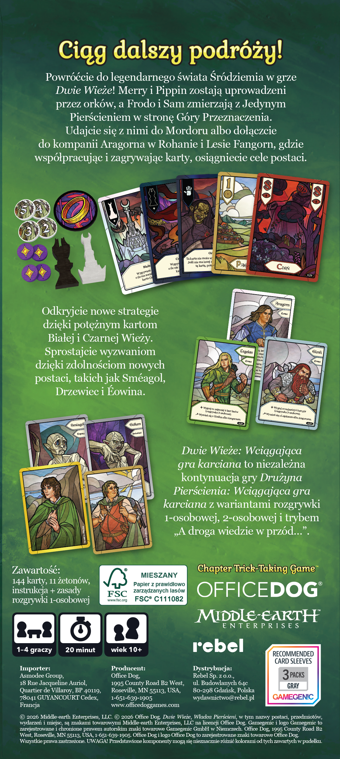 Powróćcie do legendarnego świata Śródziemia, gdzie Merry i Pippin zostają uprowadzeni przez orków, a Frodo i Sam zmierzają z Jedynym Pierścieniem w stronę Góry Przeznaczenia. Udajcie się z nimi do Mordoru albo dołączcie do kompanii Aragorna w Rohanie i Lesie Fangorn, gdzie współpracując i zagrywając karty, osiągniecie cele postaci.